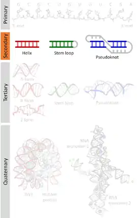 A pseudoknot is a nucleic acid secondary structure containing at least two stem-loop structures in which half of one stem is intercalated between the two halves of another stem. Pseudoknots fold into knot-shaped three-dimensional conformations but are not true topological knots. The base pairing in pseudoknots is not well nested; that is, base pairs occur that "overlap" one another in sequence position. This makes the presence of general pseudoknots in nucleic acid sequences impossible to predict by the standard method of dynamic programming, which uses a recursive scoring system to identify paired stems and consequently cannot detect non-nested base pairs with common algorithms. However, limited subclasses of pseudoknots can be predicted using modified dynamic programs.[8] Newer structure prediction techniques such as stochastic context-free grammars are also unable to consider pseudoknots.
