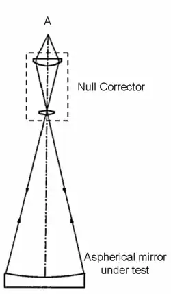However, the mirrors used in modern telescopes are not spherical – they are rotations of parabolas or hyperbolas, since these more complex shapes reduce optical aberrations and give a larger field of view. (See, for example, Ritchey-Chrétien telescope, or three-mirror anastigmats such as LSST.) Non-spherical mirrors such as these will not give a null result when tested as above, and tests that give null results are strongly preferred (they require little interpretation, and the results translate directly to polishing requirements). One solution is to introduce a null corrector, as shown in the second figure. This consists of one or more lenses and/or mirrors introduced into the optical path that make the desired mirror look like a perfectly spherical mirror. Using this device, the measured contour map now shows the difference from the desired shape instead of the difference from a sphere. Now measurement and polishing can proceed just as in the spherical case. This method is used in the manufacture of almost all large mirrors for modern telescopes.[1]