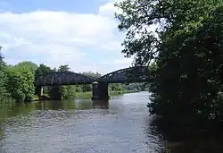 The original bridge, which opened to traffic in 1844, was constructed of timber but proved inadequate, and work on its replacement began a decade later. In 1856, the second bridge, distinguished from its predecessor by its iron structure, was completed. A third bridge was constructed in 1906–07,[11] consisting of a pair of steel bowstring spans with a pier in the centre of the river.[12][13] In 1929 a new arched brick-built northern abutment was constructed.