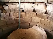 Starting from the late Bronze Age, a peculiar type of circular structure with a central basin and benches located all around the circumference of the room start to appear in Nuragic settlements, the best example of this type of structure is the ritual fountain of Sa Sedda e Sos Carros, near Oliena, where thanks to a hydraulic implant of lead pipes water was poured down from the ram shaped protomes inside the basin.[69] Some archaeologists interpreted these buildings, with ritual and religious function,[70] as thermal structures.[71]