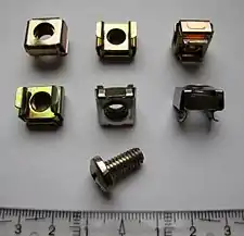 | Cage nut | Caged nut, captive nut, clip nut | ![]() |