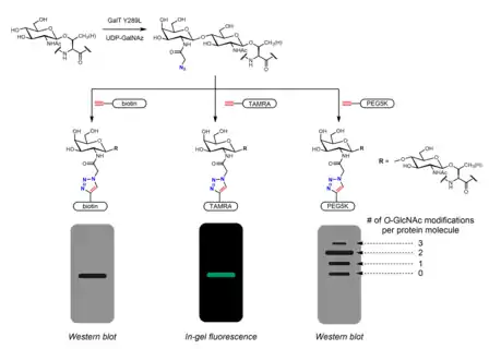Chemoenzymatic labeling provides an alternative strategy to incorporate handles for click chemistry. The Click-IT O-GlcNAc Enzymatic Labeling System, developed by the Hsieh-Wilson group and subsequently commercialized by Invitrogen, utilizes a mutant GalT Y289L enzyme that is able to transfer azidogalactose (GalNAz) onto O-GlcNAc.[28][37] The presence of GalNAz (and therefore also O-GlcNAc) can be detected with various alkyne-containing probes with identifiable tags such as biotin,[37] dye molecules,[28] and PEG.[29]