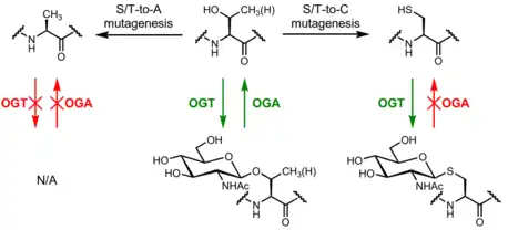 Site-directed mutagenesis of O-GlcNAc-modified serine or threonine residues to alanine may be used to evaluate the function of O-GlcNAc at specific residues. As alanine's side chain is a methyl group and is thus not able to act as an O-GlcNAc site, this mutation effectively permanently removes O-GlcNAc at a specific residue. While serine/threonine phosphorylation may be modeled by mutagenesis to aspartate or glutamate, which have negatively charged carboxylate side chains, none of the 20 canonical amino acids sufficiently recapitulate the properties of O-GlcNAc.[58] Mutagenesis to tryptophan has been used to mimic the steric bulk of O-GlcNAc, though tryptophan is much more hydrophobic than O-GlcNAc.[59][60] Mutagenesis may also perturb other post-translational modifications, e.g., if a serine is alternatively phosphorylated or O-GlcNAcylated, alanine mutagenesis permanently eliminates the possibilities of both phosphorylation and O-GlcNAcylation.