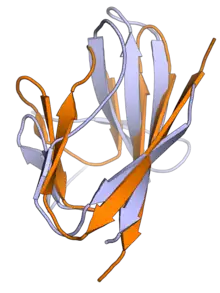 ORF8 in SARS-CoV-2 encodes a protein of 121 amino acid residues with an N-terminal signal sequence.[4] ORF8 forms a dimer that is covalently linked by disulfide bonds.[1] It has an immunoglobulin-like domain with distant similarity to the ORF7a protein.[1][2] Despite a similar overall fold, an insertion in ORF8 likely is responsible for different protein-protein interactions and creates an additional dimerization interface.[1][2] Unlike ORF7a, ORF8 lacks a transmembrane helix and is therefore not a transmembrane protein,[1][4] though it has been suggested it might have a membrane-anchored form.[3]