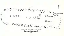 A total of 8 house structures and 17 features were identified during the 1958 excavations. The house structures ranged from 25 to 47.5 feet long and 12–15 feet wide. Some of the houses had pit features as well (fire pits and refuse pits).[2]
