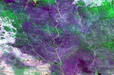 False colour composite satellite image showing the middle Mzingwane River.[1] The site for Oakley Block Dam is the mountains in the centre of the image.