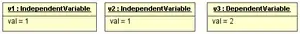 In the second diagram, at a slightly later point in time, the IndependentVariable and DependentVariable objects are the same, but the slots for the val attribute have different values. The role names are not shown here.