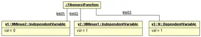 In the first UML object diagram on the right, the instance in the leftmost instance specification is named v1, has IndependentVariable as its classifier, plays the NMinus2 role within the FibonacciSystem, and has a slot for the val attribute with a value of 0. The second object is named v2, is of class IndependentVariable, plays the NMinus1 role, and has val = 1. The DependentVariable object is named v3, and plays the N role. The topmost instance, an anonymous instance specification, has FibonacciFunction as its classifier, and may have an instance name, a role, and slots, but these are not shown here. The diagram also includes three named links, shown as lines. Links are instances of an association.