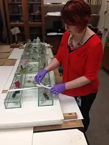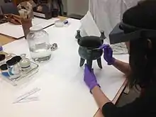 An Objects conservator is a professional, working in a museum setting or private practice, that specializes in the conservation of three-dimensional works. They undergo specialized education, training, and experience that allows them to formulate and implement preventive strategies and invasive treatment protocols to preserve cultural property for the future.[1] Objects conservators typically specialize in one type of material or class of cultural property, including metals, archaeological artifacts, ethnographic artifacts, glass, and ceramic art. Objects conservation presents many challenges due to their three-dimensional form and composite nature.