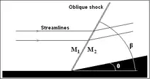 An oblique shock wave is a shock wave that, unlike a normal shock, is inclined with respect to the incident upstream flow direction. It will occur when a supersonic flow encounters a corner that effectively turns the flow into itself and compresses. The upstream streamlines are uniformly deflected after the shock wave. The most common way to produce an oblique shock wave is to place a wedge into supersonic, compressible flow. Similar to a normal shock wave, the oblique shock wave consists of a very thin region across which nearly discontinuous changes in the thermodynamic properties of a gas occur. While the upstream and downstream flow directions are unchanged across a normal shock, they are different for flow across an oblique shock wave.