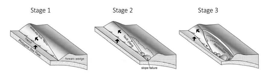 In the plate boundary, an approximately 80 km long and 30 km wide depression is observed.[11] It obscures trench parallel strike slip fault and the topographic ridge of the wedge.[11]