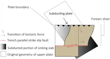 Forearc slivers are partly detached continental blocks of the overriding plates.[14] They are bounded by the trenches and trench parallel strike slip fault systems.[14] The motion of forearc slivers depend on the obliquity of the subducting slabs.[14]