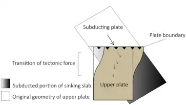The orientation of tectonic force gradually rotates toward the trench normal direction. This attributes to the decline of trench parallel component when the force leaves the plate coupling zone.[27][32][34] In this way, only the frontal part, rather than the whole upper plate, is dragged by the subducting slab.[27]