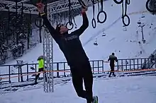 Obstacle course racing (OCR) is a sport in which a competitor, traveling on foot, must overcome various physical challenges in the form of obstacles. Races vary in length from courses with obstacles close together to events of several kilometers[1] which incorporate elements of track, road and/or cross country/trail running. Courses may include climbing over walls or up ropes, monkey bars, carrying heavy objects, traversing bodies of water or mud, crawling under barbed wire, and jumping through fire.[2][3]