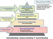 An occupational exposure limit is an upper limit on the acceptable concentration of a hazardous substance in workplace air for a particular material or class of materials. It is typically set by competent national authorities and enforced by legislation to protect occupational safety and health. It is an important tool in risk assessment and in the management of activities involving handling of dangerous substances.[1] There are many dangerous substances for which there are no formal occupational exposure limits. In these cases, hazard banding or control banding strategies can be used to ensure safe handling.
