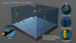 The Irminger Sea Array includes a set of four moorings. With a distance between moorings approximately ten times that of the water depth, the array is able to collect data on the mesoscale variability. One mooring site consists of a paired Global Surface and subsurface Global Hybrid Profiler mooring. The other two sites consist of subsurface Global Flanking Moorings. The water above the subsurface Global Hybrid Profiler Mooring is sampled by vertically profiling gliders. The water in and around the array is sampled by open-ocean gliders collecting data on spatial variability. Data from the gliders is transmitted wirelessly though an acoustic moden to the moorings and to a satellite for transmission to OOI's servers. Wireless reprogramming of the gliders and certain parts of the array is also possible to collect data on sudden events or environmental changes.[31]