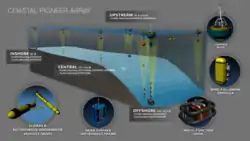 The Coastal Pioneer Array is a network of platforms and sensors that operate on the continental shelf and slope south of New England. A moored array is centered at the shelf break in the Mid-Atlantic Bight south of Cape Cod, Massachusetts. In 2024, the Coastal Pioneer Array will be relocated to the southern Mid-Atlantic Bight, between Cape Hatteras and Norfolk Canyon off the coast of North Carolina.[24]