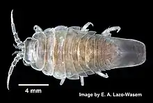 ![]() The isopod Idotea metallica Idotea metallica is a remarkable surface-associated isopod, that can be found either floating upside down on the ocean's surface [1] or attached to floating debris or neuston (such as the bubble rafts of Janthina). It is commonly associated with flotsam,[60] and is capable of actively swimming from one floating object to another. This species ostensibly occurs globally in warm waters, though as with many surface-associated species, information on its genetic diversity is scares. It is often flushed into more northern regions by shifting currents. For individuals arriving in the summer months in Helgoland (Germany; North Sea) the fundamental thermal niche is 16 °C, with the coldest tolerable temperature likely around 13 °C.[61] However, these thermal tolerance limits should be considered with caution: like many neustonic species, I. metallica is poorly studied, and whether it is truly one species or many cryptic species is unclear.[1] | |