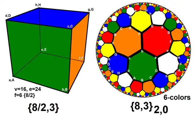 The regular map {8,3}2,0 can be seen as a 6-coloring of the {8,3} hyperbolic tiling. Within the regular map, octagons of the same color are considered the same face shown in multiple locations. The 2,0 subscripts show the same color will repeat by moving 2 steps in a straight direction following opposite edges. This regular map also has a representation as a double covering of a cube, represented by Schläfli symbol {8/2,3}, with 6 octagonal faces, double wrapped {8/2}, with 24 edges, and 16 vertices. It was described by Branko Grünbaum in his 2003 paper Are Your Polyhedra the Same as My Polyhedra?[1]