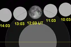 A lunar eclipse will be preceded and followed by solar eclipses by 9 years and 5.5 days (a half saros).[4] This lunar eclipse is related to two solar eclipses of Solar Saros 143.