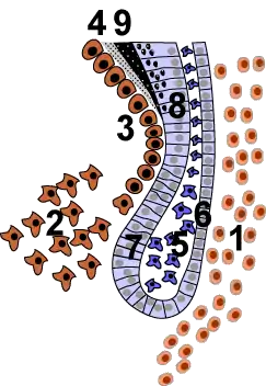 ![]() The cervical loop area: (1) dental follicle cells, (2) dental mesenchyme, (3) Odontoblasts, (4) Dentin, (5) stellate reticulum, (6) outer enamel epithelium, (7)inner enamel epithelium, (8) ameloblasts, (9) enamel. | |