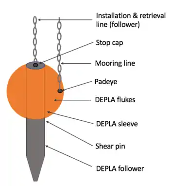 The dynamically-embedded plate anchor (DEPLA) is a direct-embedment, vertically-loaded anchor that consists of a plate embedded in the seabed by the kinetic energy obtained by freefall in water. This new anchor concept has only been recently developed but has been tested both in the lab and field. The different components of the DEPLA can be seen in the labeled diagram in the figure.