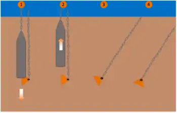 Drag-embedment anchors (DEA) derive their holding capacity from being buried, or embedded, deep within the seabed with their anchoring capacity being directly related to embedment depth. DEAs are installed by means of dragging, using a mooring chain or wire, this relatively simple means of installation making the DEA a cost-effective option for anchoring offshore structures. DEAs are commonly used for temporary moorings of offshore oil and gas structures, e.g. mobile offshore drilling units. Their use in only temporary mooring situations may be largely attributed to uncertainty involving the anchor's embedding trajectory and placement in the soil, which results in uncertainty with regard to the anchor's holding capacity.[2]