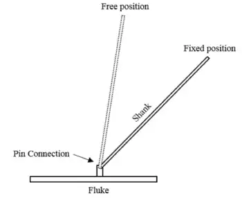 The fluke of a plate anchor is a bearing plate that provides the large majority of the anchors holding capacity at its ultimate embedment depth. As well as contributing to anchor capacity, the fluke may contribute to anchor stability during embedment. Adopting a wider fluke can help in providing rolling stability which allows for deeper embedment and better holding capacity.[4] There are industry guidelines pertaining to both the appropriate width, length, and thickness of anchor flukes, where width refers to the dimension perpendicular to the direction of embedment. Commercial anchors typically have a fluke width-to-length ratio of 2:1 and a fluke length-to- thickness ratio between 5 and 30.[4]