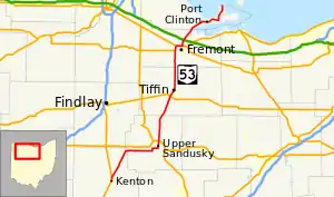 From Kenton, State Route 53 moves northeast to Forest, then continues eastward to Upper Sandusky. It then moves north through the small towns of Tymochtee and McCutchenville before entering Tiffin. The route then moves due north to Fremont, where it joins a four-route bypass around the city with U.S. Routes 6 and 20 and State Route 19. From its northern bypass interchange, it continues on a northeast heading, following the northern coastline of Sandusky Bay to Port Clinton, where it joins State Route 2 on a bypass around that city. From its eastern bypass interchange, State Route 53 heads north onto Catawba Island.