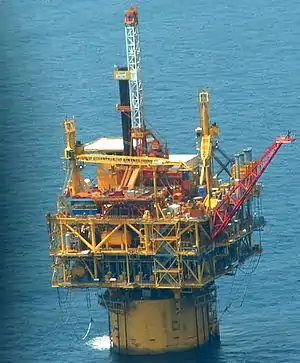 An oil platform (or oil rig, offshore platform, oil production platform, and similar terms) is a large structure with facilities to extract and process petroleum and natural gas that lie in rock formations beneath the seabed. Many oil platforms will also have facilities to accommodate the workers, although it is also common to have a separate accommodation platform bridge linked to the production platform. Most commonly, oil platforms engage in activities on the continental shelf, though they can also be used in lakes, inshore waters, and inland seas. Depending on the circumstances, the platform may be fixed to the ocean floor, consist of an artificial island, or float.[1] In some arrangements the main facility may have storage facilities for the processed oil. Remote subsea wells may also be connected to a platform by flow lines and by umbilical connections. These sub-sea facilities may include of one or more subsea wells or manifold centres for multiple wells.
