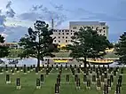 Residents of Oklahoma City suffered substantial losses on April 19, 1995, when Timothy McVeigh detonated a bomb in front of the Murrah building. The building was destroyed (the remnants of which had to be imploded in a controlled demolition later that year), more than 100 nearby buildings suffered severe damage, and 168 people were killed.[28] The site has been commemorated as the Oklahoma City National Memorial and Museum.[29] Since its opening in 2000, over three million people have visited. Every year on April 19, survivors, families, and friends return to the memorial to read the names of each person lost. McVeigh was executed by lethal injection on June 11, 2001.