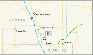 State Highway 17A (SH-17A) is a 3.10-mile (4.99 km) long[1] long state highway in south-central Oklahoma. It connects Interstate 35 (I-35) to U.S. Route 77 (US-77) near Wynnewood. It does not connect to its implied parent, State Highway 17.