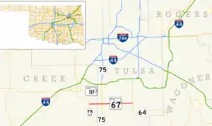 State Highway 67 is split between the counties of Creek and Tulsa County. The first 1.92 miles (3.09 km) of the route lie in Creek County,[1] while the remainder of the route, 8.02 miles (12.91 km), falls within Tulsa County.[2]