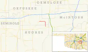 State Highway 84 (SH-84) is a short state highway in Okfuskee and Hughes Counties in Oklahoma. It begins at State Highway 9 in Dustin and runs northwest to end at U.S. Highway 75 near Weleetka. It passes through Hughes County for 1.34 miles (2.16 km)[1] and Okfuskee County for 8.51 miles (13.70 km),[2] for a total length of 9.85 miles (15.85 km). It has no lettered spur routes.