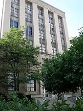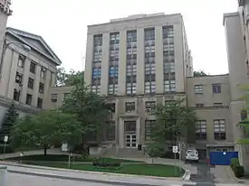 Old Engineering Hall is an academic building at 3943 O'Hara Street on the campus of the University of Pittsburgh in Pittsburgh, Pennsylvania, United States. The building was completed for $1.2 million[1]($12.1 million today) in October, 1955.[2] The seven floor building connects Allen Hall and Thaw Hall, as well as the Van de Graaff Building which was added later. The frieze around the top of the building includes bas-relief of the insignia of several engineering societies. Originally called Engineering Hall, it initially contained engineering offices, classrooms, laboratories, a library, and in the basement, a wind tunnel for the aeronautical engineering department testing of airfoil surfaces.[3][4]