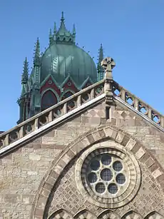 The church building was designed between 1870 and 1872 by the Boston architectural firm of Cummings and Sears in the Venetian Gothic style. The style follows the precepts of the British cultural theorist and architectural critic John Ruskin (1819–1900) as outlined in his treatise The Stones of Venice. Old South Church in Boston remains one of the most significant examples of Ruskin's influence on American architecture. The architects, Charles Amos Cummings and Willard T. Sears, also designed the Isabella Stewart Gardner Museum. The exterior of the church is primarily built of Roxbury Conglomerate commonly called puddingstone. Many arches, and several walls of stone, are striped with alternating courses of yellow-beige and deep red sandstone. The porticos and large open arches in the campanile are decorated with simple plate tracery. The upper arches of the porticos are decorated with screens of ornate wrought iron. The building is roofed in alternating bands of red and dark gray slate and the roofline finished with ornamental iron cresting.