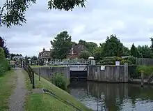 Old Windsor Lock is a lock on the River Thames in England on the right bank beside Old Windsor, Berkshire. The lock marks the downstream end of the New Cut, a meander cutoff built in 1822 by the Thames Navigation Commissioners which created Ham Island. The lock and a wider footbridge give access to the island. Two weirs are associated; the smaller adjoins and the larger is upstream. The lock is the ninth lowest of the forty-five on the river.