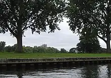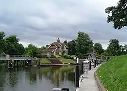 In 1822 the lock cut and lock were built by the Thames Navigation Commissioners, considerably shortening the navigation and towpath. Instead of a weir, a less formal obstruction, eel bucks, "Newman's Bucks", retained water around two islets above the cut. The islets measured in the 1890s 0.59 acres (0.24 ha) and 1.4 1.4 acres (0.57 ha).[2] The smaller, downstream one, is Lion Island. The first lock keeper was dismissed after demeanors which included digging through the bank of the lock cut and thereby causing the collapse of the new lock cut bridge. The weir was constructed in 1836. In 1868 there was discussion of removing the lock, but instead it was extended with a tumbling bay added. In 1871 the lock cut bridge was rebuilt with the right reserved to lay sewage pipes across it.[3] The island has the sanitation works for Windsor.[4] The lock was rebuilt in 1957.