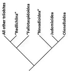 The suborder contains four superfamilies: Olenelloidea (with 3 families and 5 stemgroup genera), Judomioidea (with 1 family and 3 stemgroup genera), Nevadioidea, and Fallotaspidoidea (with 3 families and 3 stemgroup genera). Lieberman, 2002, considered that the Fallotaspidoidea are a paraphyletic group because it gave rise to the Redlichiina; he did not propose to restrict the Olenellina to the Olenelloidea, Judomioidea and Nevadioidea. Neither did he propose to assign this group of superfamilies to a newly formed order Olenellida, and consequently expand the Redlichiina to include the Fallotaspidoidea. This would imply that the Redlichiina would include taxa with and without dorsal sutures.[3]