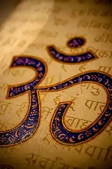 Om (or Aum) (listen ; Sanskrit: ॐ, ओम्, romanized: Ōṃ) is a sacred sound, syllable, mantra, and an invocation in Hinduism.[1][2] Om is one of the most important symbols of Hinduism.[3] It is variously said to be the essence of the supreme Absolute,[2] consciousness,[4][5][6] Ātman, Brahman, or the cosmic world.[7][8][9] In Indic traditions, Om serves as a sonic representation of the divine, a standard of Vedic authority and a central aspect of soteriological doctrines and practices.[10] The syllable is often found at the beginning and the end of chapters in the Vedas, the Upanishads, and other Hindu texts.[9]