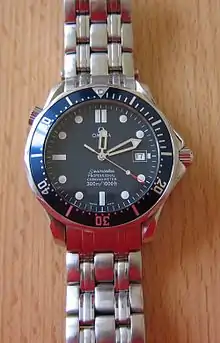 The Omega Seamaster is a line of automatic winding mechanical diving watches from Omega with a history that can be traced back to the original water-resistant dress watch released in 1948. The Seamaster collection is perhaps best known today for the Seamaster Diver Professional 300m model that has been worn in the James Bond movie franchise since 1995. Originally conceived as a dressy, water-resistant timepiece, the Omega Seamaster has evolved to a robust sports watch line typically with a stainless steel case, robust water resistance, and an official certified chronometer certified movement within. The Diver Professional 300m is most famous for its "train track" five link steel bracelet, its helium release valve at the 10:00 position, the wave pattern dial on certain model generations, and the skeletonized handset.
