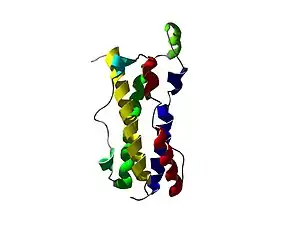 The three-dimensional structure of human OSM has been solved to atomic resolution, confirming the predicted long chain four helix bundle topology.[14] Comparing this structure with the known structures of other known LC cytokines shows it to be most closely related to LIF (RMSD of 2.1 Å across 145 equivalent Cα). A distinctive kink in the A helix arises from departure of the classical alpha helical H-bonding pattern, a feature shared with all known structures of LIFR using cytokines. This "kink" results in a different special positioning of one extreme of the bundle to the other, significantly affecting the relative positioning of site III with sites I and II (see:Receptor recruitment sites)