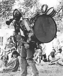 The earliest known records of multiple musical instruments being played at the same time date from the 13th century, and were the pipe and tabor. The pipe was a simple three-holed flute that could be played with one hand; the tabor is more commonly known today as a snare drum. This type of playing can still be heard in parts of rural France, in England[1] and Spain. An Elizabethan-era woodcut shows a clown playing the pipe and tabor. An 1820s watercolour painting shows a one-man band with a rhythm-making stick, panpipes around his neck and a bass drum and tambourine beside him. Henry Mayhew's history of London street life in the 1840s and 1850s described a blind street performer who played bells, the violin and accordions.[2]