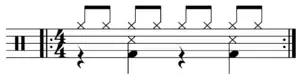 This may be seen in the drum notation for the typical rock drum pattern: