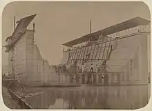 In Amsterdam the dock would be constructed, but not entirely riveted. It would then be taken apart again and be assembled in Surabaya. Readying the construction site, and getting the iron took quite some time, and it was almost May before good progress was made. On 7 April 1864 Prince Napoléon Bonaparte visited the shipyard of Van Vlissingen en Dudok van Heel, and especially the iron floating drydock under construction.[11] On 9 June 1864 some members of the Royal Institute of Engineers visited the floating dock after attending their annual meeting. Van Vlissingen en Dudok van Heel made pictures and sent them to the members of the institute.[12] The final cost of the floating dock would be 460,852 guilders, of those 41,018 were for transport.[10]