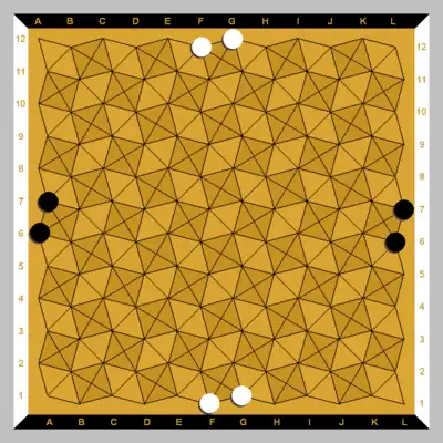 The Onyx board is a grid of interlocking squares and triangles, with pieces played on the points of intersection (as in Go). Each side of the board comprises twelve points. Black tries to connect the two horizontal (black) sides with an unbroken chain of black pieces, while White tries to connect the two vertical (white) sides with an unbroken chain of white pieces. The first to do so wins the game.