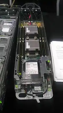 Open Vault storage building blocks offer high disk densities, with 30 drives in a 2U Open Rack chassis designed for easy disk drive replacement. The 3.5 inch disks are stored in two drawers, five across and three deep in each drawer, with connections via serial attached SCSI.[16] This storage is also called Knox, and there is also a cold storage variant where idle disks power down to reduce energy consumption.[17] Another design concept was contributed by Hyve Solutions, a division of Synnex in 2012.[18][19] At the OCP Summit 2016 Facebook together with Taiwanese ODM Wistron's spin-off Wiwynn introduced Lightning, a flexible NVMe JBOF (just a bunch of flash), based on the existing Open Vault (Knox) design.[20][21]