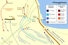 In the centre, the 7th Royal Tank Regiment reached Fort Capuzzo by noon and scattered the defenders, who retreated north to join the 15th Panzer Division, between them and Bardia.[39] Soon afterwards, they faced several counter-attacks by a battalion from the 8th Panzer Regiment of the 15th Panzer Division. After being joined by the 22nd Guards Brigade, they faced the final and largest counter-attack at 18:30 but managed to repulse it.[40] These were not serious assaults, as Rommel would not commit the 15th Panzer Division to battle without more information on the situation. The 8th Panzer Regiment skirmished briefly and then feigned a disorderly retreat to lure Matilda tanks into a chase into range of concealed anti-tank guns. Neither side took much damage from these actions.[41] In response to the British capture of Capuzzo and concerned with a possible attack on Sollum and Bardia, Rommel ordered the 5th Light Division to Sidi Azeiz ready for a possible counter-attack.[42]