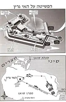 Half the raiders cleared or blocked the southern half of the island and the fortress, while the other half eliminated the anti-aircraft equipment and determined that the radar was fake.[6] The operation was complicated by the fact that most of their hand grenades were rendered useless by the swim at deeper than expected depths due to each man's heavy load. This breaching of the island's defences was supported by a separate Naval Commando team providing covering fire and diversion with a bazooka and a light machine gun from a small rock outcropping just south of the island, having reached it by Swimmer Delivery Vehicles (SDV). At this point the commander of the first wave, Lieutenant Dov Bar, signalled the second wave to come in using a flare. To avoid catching the approaching second wave in a cross fire a second flare by Bar signalled the covering fire and diversion team on the rock outcropping to stand down and withdraw, which they did successfully. The second wave, which had been idling in their Zodiacs in the Gulf, now trailing the first wave's recovered boats, roared up to the island. They quickly set up a command post and aid station and took out the 85 mm gun emplacements.