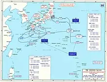 Operation Downfall was the proposed Allied plan for the invasion of the Japanese home islands near the end of World War II. The planned operation was canceled when Japan surrendered following the atomic bombings of Hiroshima and Nagasaki, the Soviet declaration of war, and the invasion of Manchuria.[1] The operation had two parts: Operation Olympic and Operation Coronet. Set to begin in November 1945, Operation Olympic was intended to capture the southern third of the southernmost main Japanese island, Kyūshū, with the recently captured island of Okinawa to be used as a staging area. In early 1946 would come Operation Coronet, the planned invasion of the Kantō Plain, near Tokyo, on the main Japanese island of Honshu. Airbases on Kyūshū captured in Operation Olympic would allow land-based air support for Operation Coronet. If Downfall had taken place, it would have been the largest amphibious operation in history, surpassing D-Day.[2]